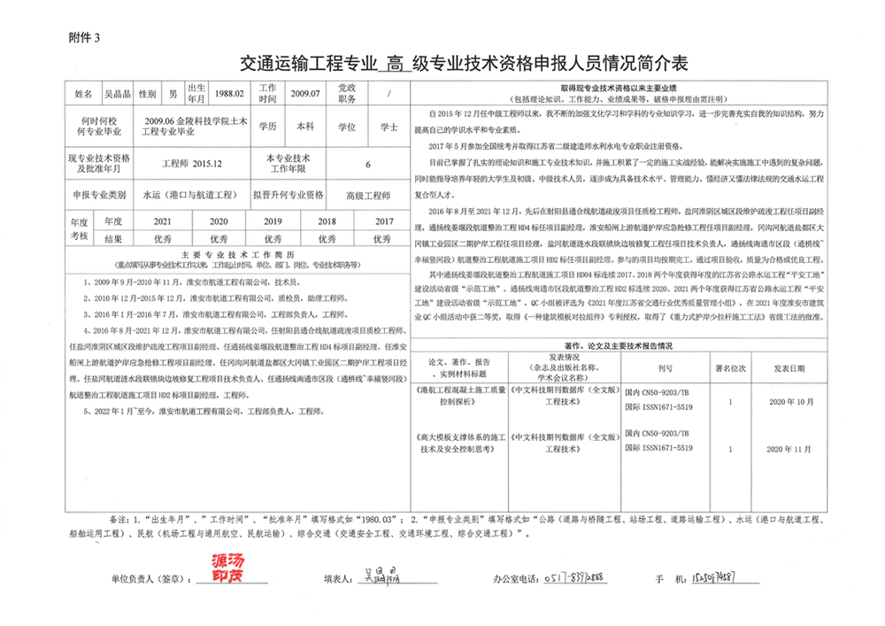 關(guān)于吳晶晶同志申報(bào)交通運(yùn)輸工程水運(yùn)(港口與航道工程)專業(yè)高級工程師的公…