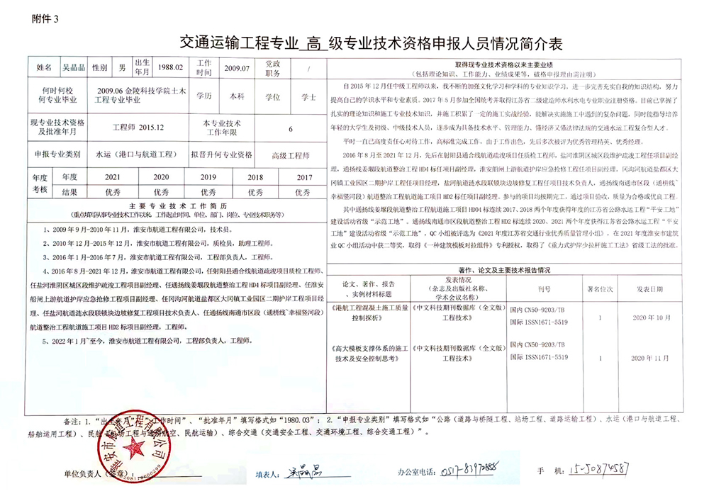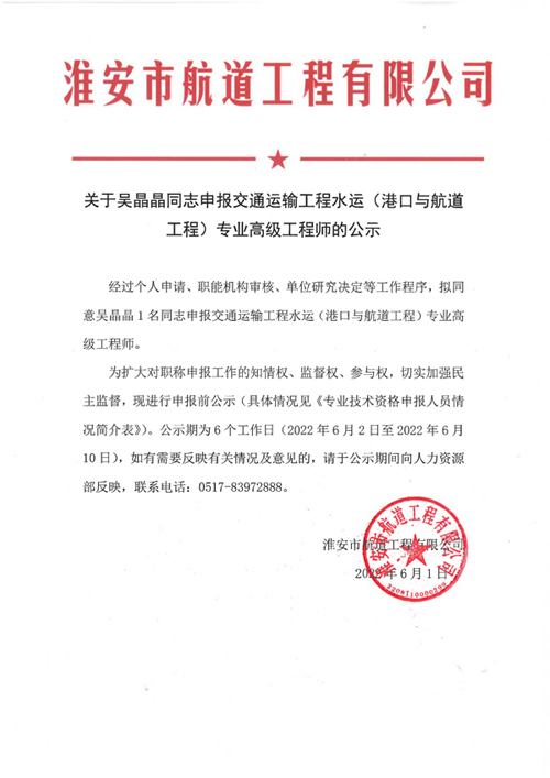 關(guān)于吳晶晶同志申報交通運輸工程水運(港口與航道工程)專業(yè)高級工程師的公示
